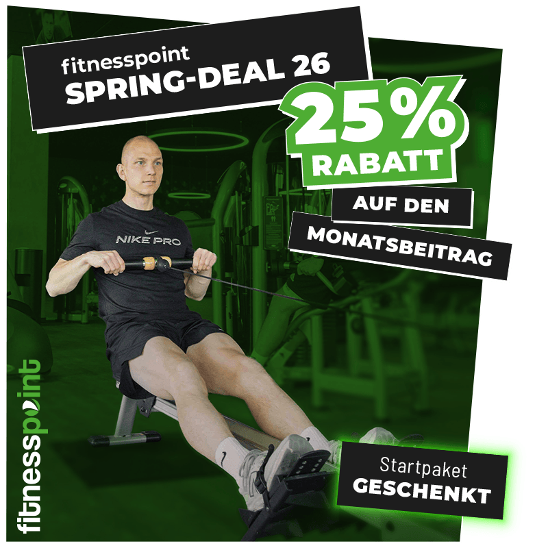 Das ist der Spring-Deal bei fitnesspoint: Es gibt 25% Rabatt auf den Monatsbeitrag.* Das Startpaket im Wert von 49,99€ gibt’s on Top geschenkt.